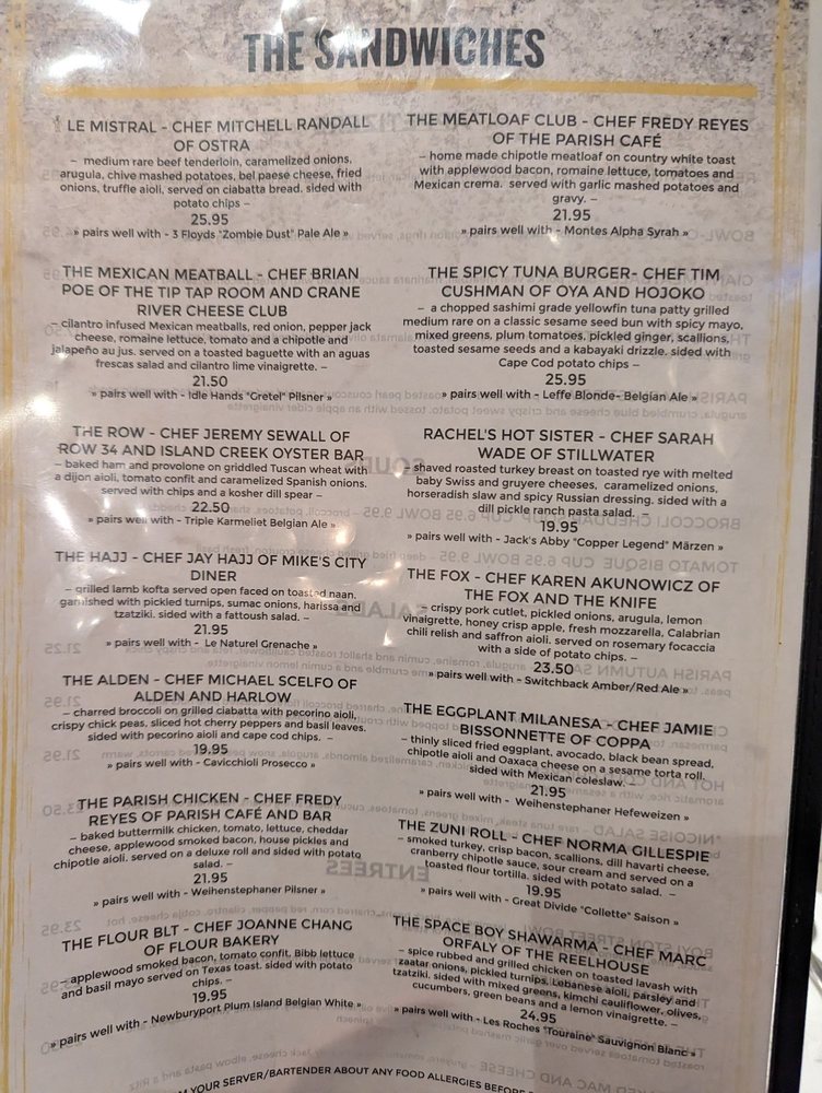 CHEF FREDY REYES OF THE PARISH CAFE- potato chip crusted fried chicken with Swiss and bacon on a buttery potato roll topped with a habanero mango bbq sauce and guajillo chili slaw. sided with Cape Cod potato chips.